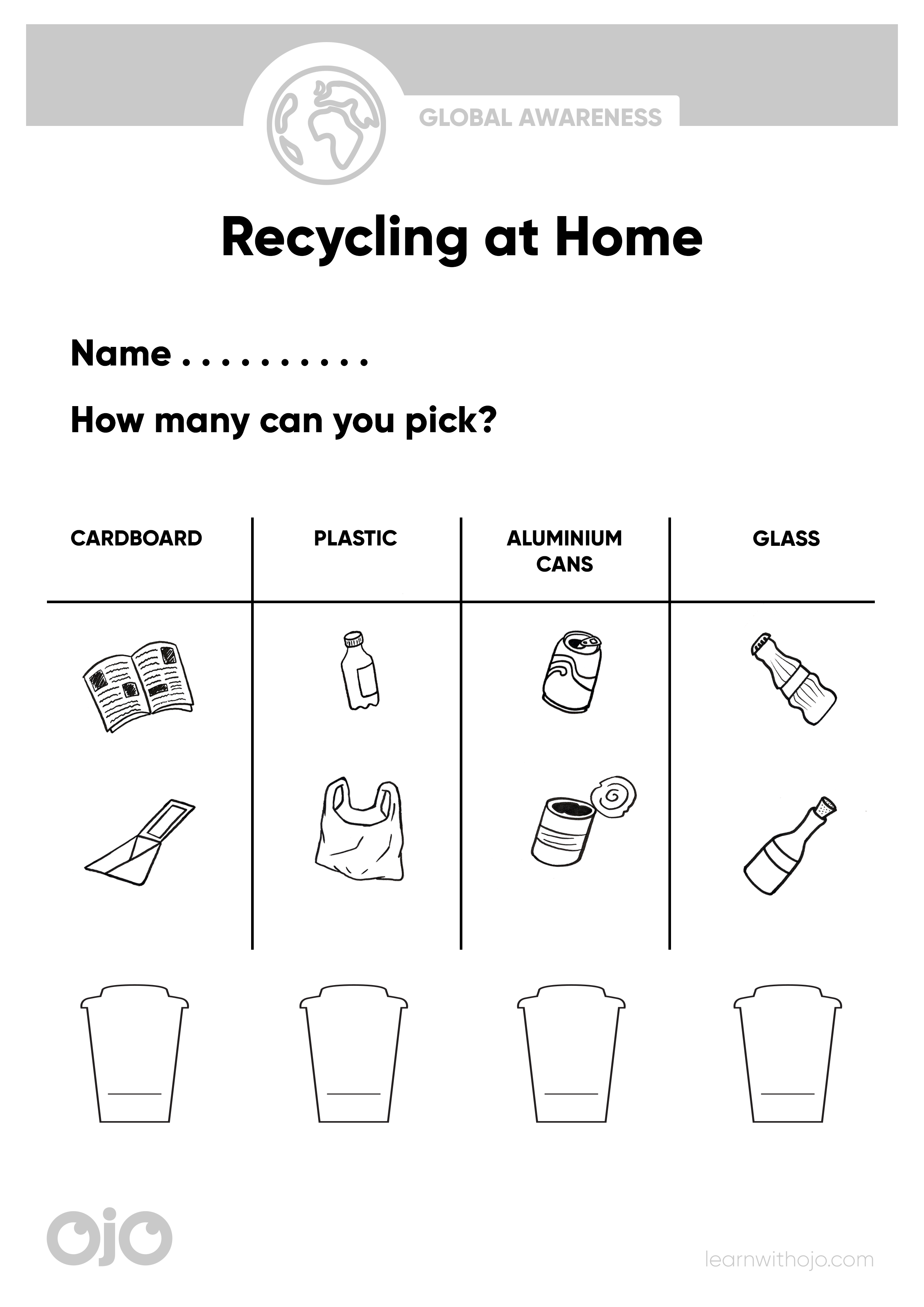 Prepare everything that you will need for this activity. Have a dig through the recycling box and gather a selection of your clean household waste. Make sure to remove anything with sharp edges! Print the Recycle at Home worksheet and arrange some containers for your little one to sort the items into.