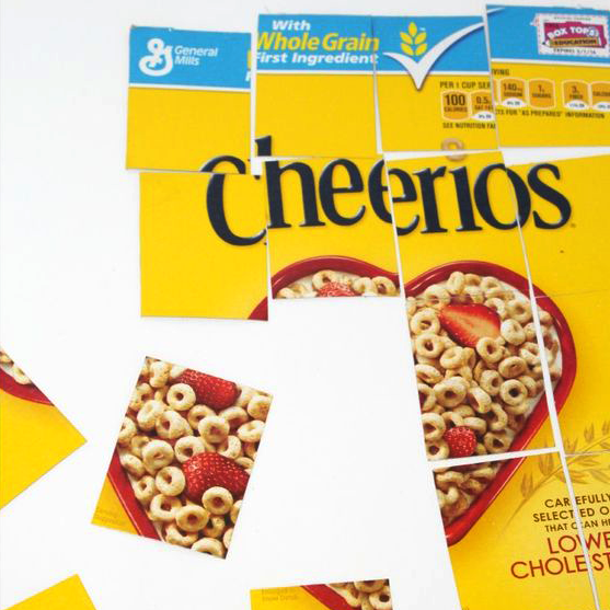 Make a simple puzzle. Cut the front of a cereal packet into 15–20 pieces.