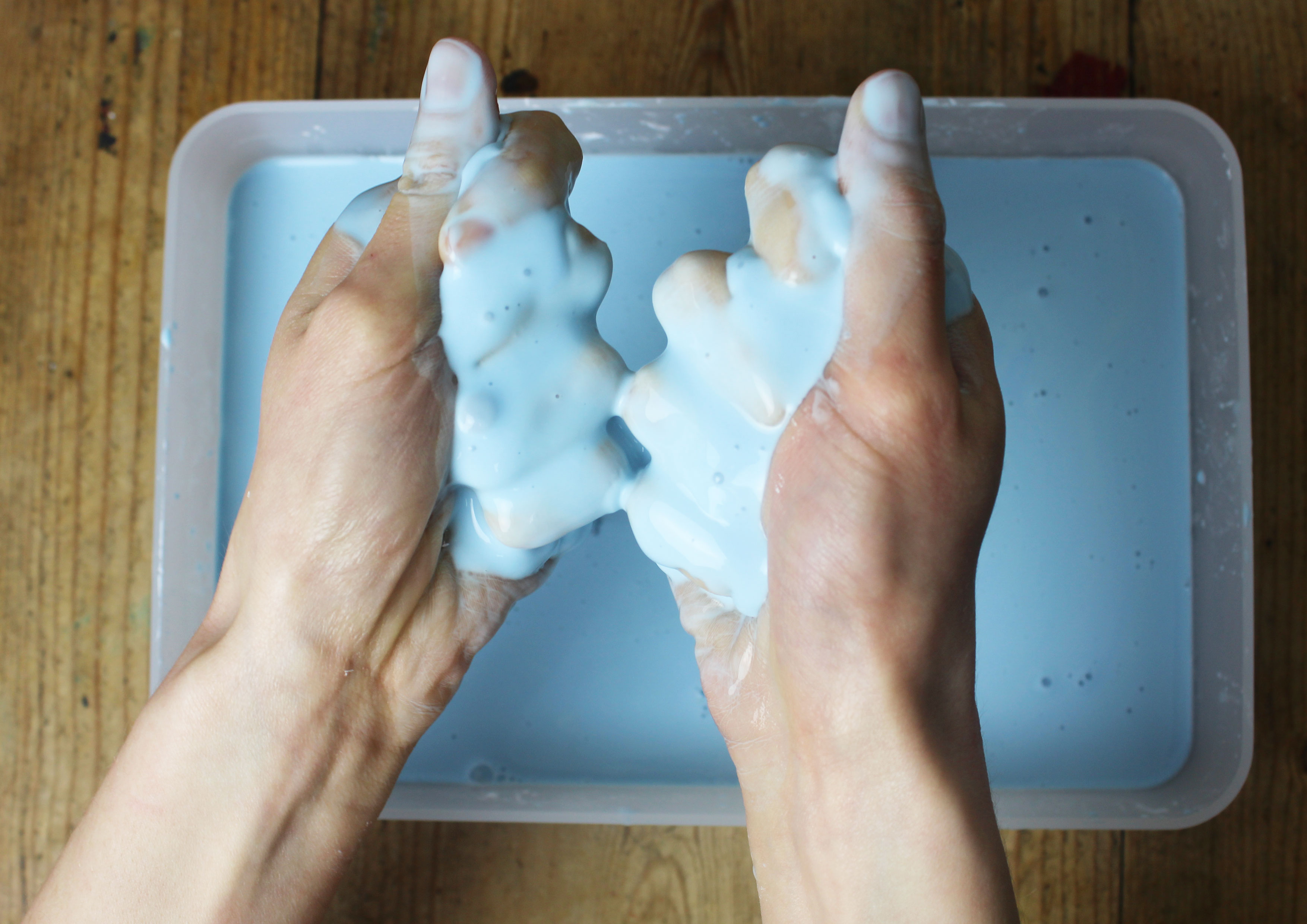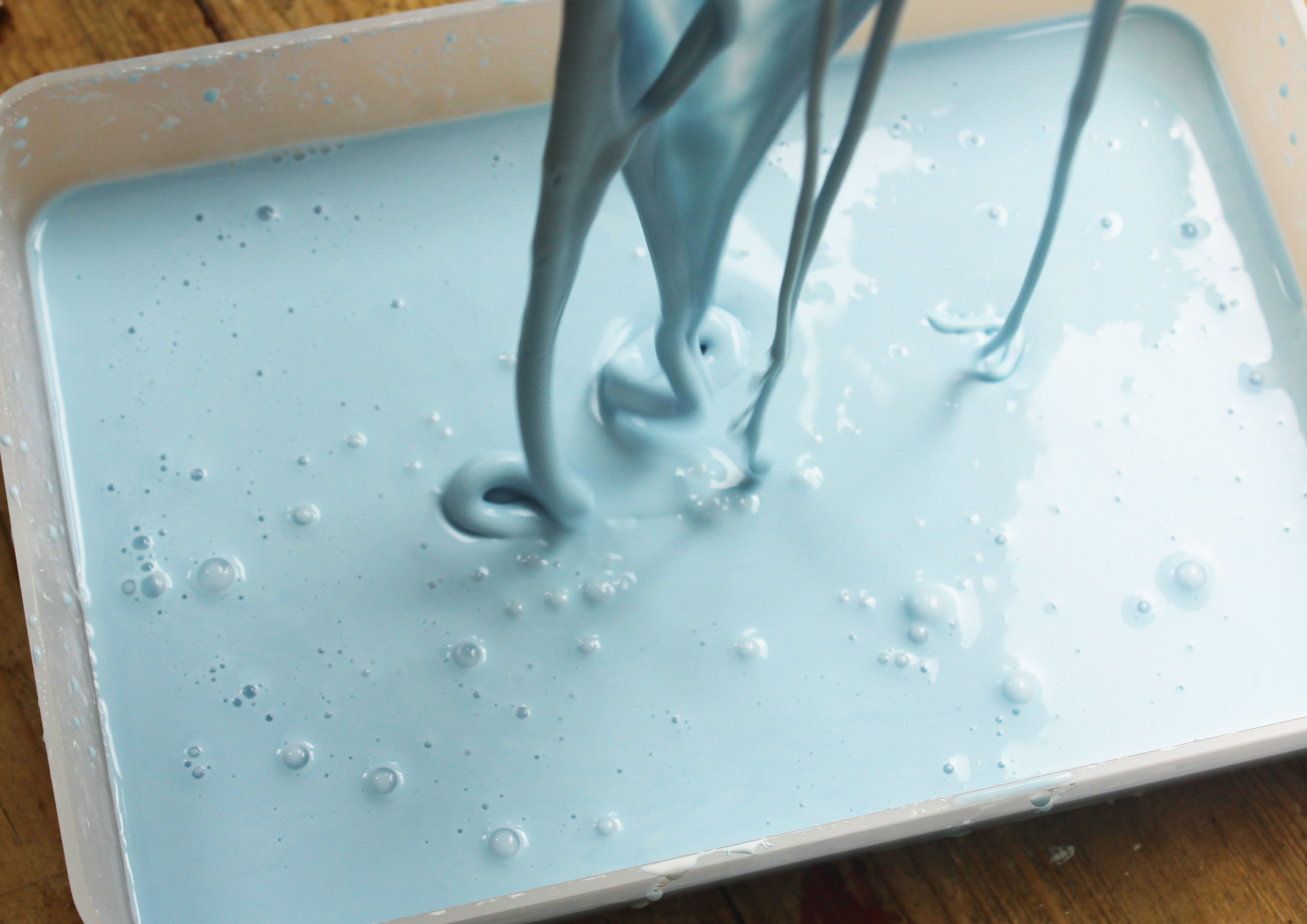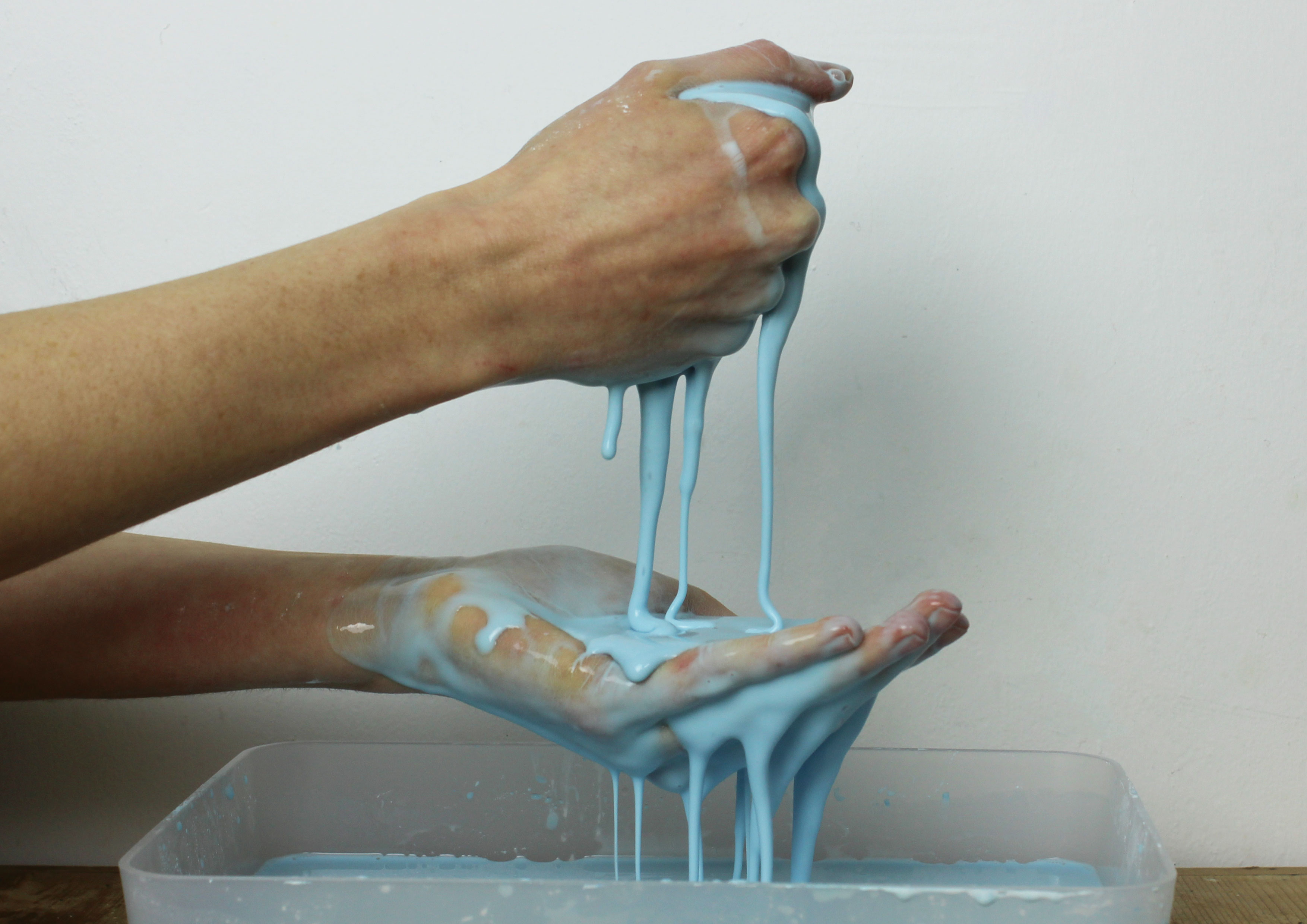 When water is added to cornflour, its particles spread out rather than dissolve - so GOOP can act as both a solid and a liquid. When GOOP is played with in your hands it appears solid, but if it’s left to rest, it becomes liquid (and may dribble over your table!)