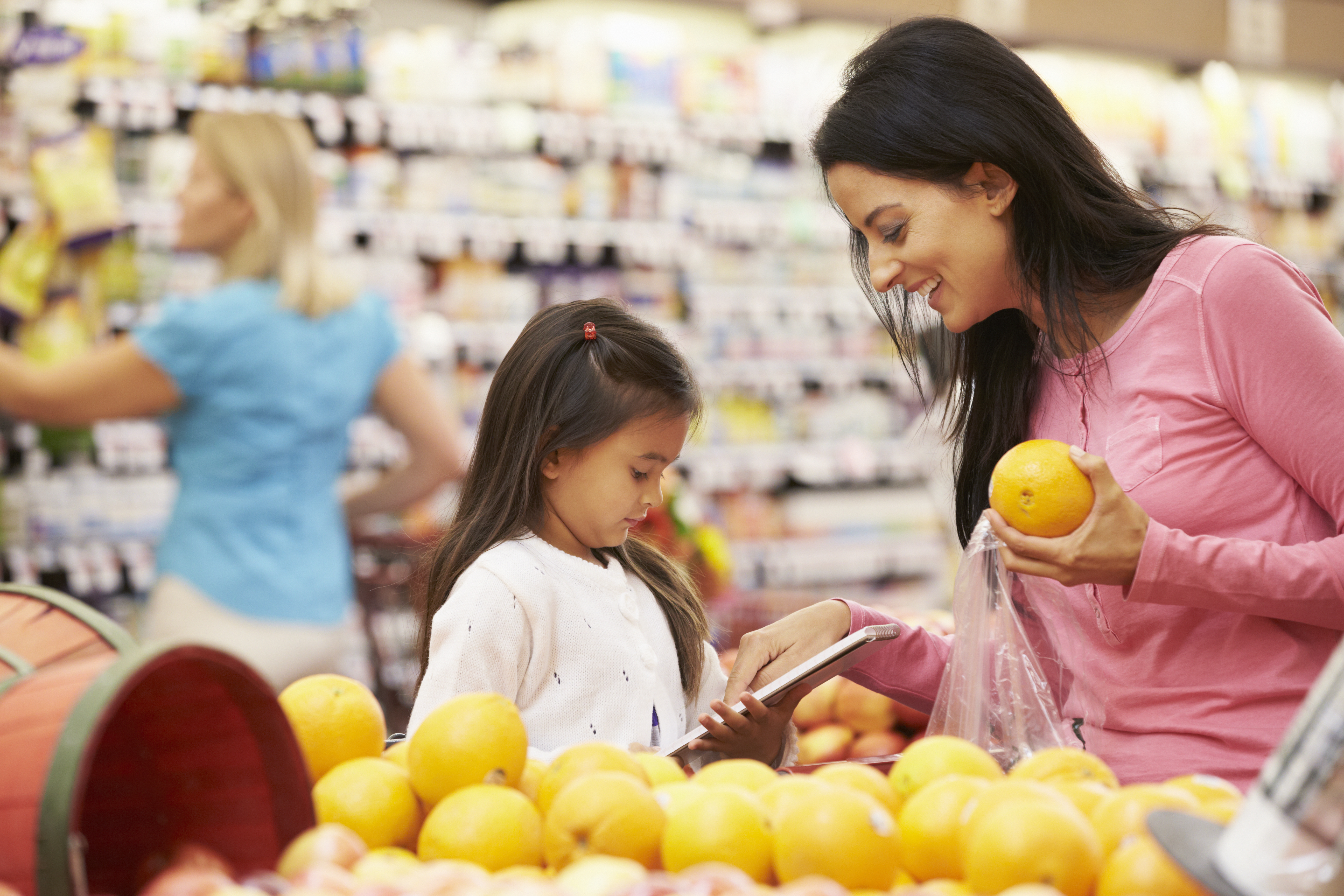 Keep up a running commentary while encouraging your child to take the lead whenever possible. Tick off items as you go and tackle the checkout together!
