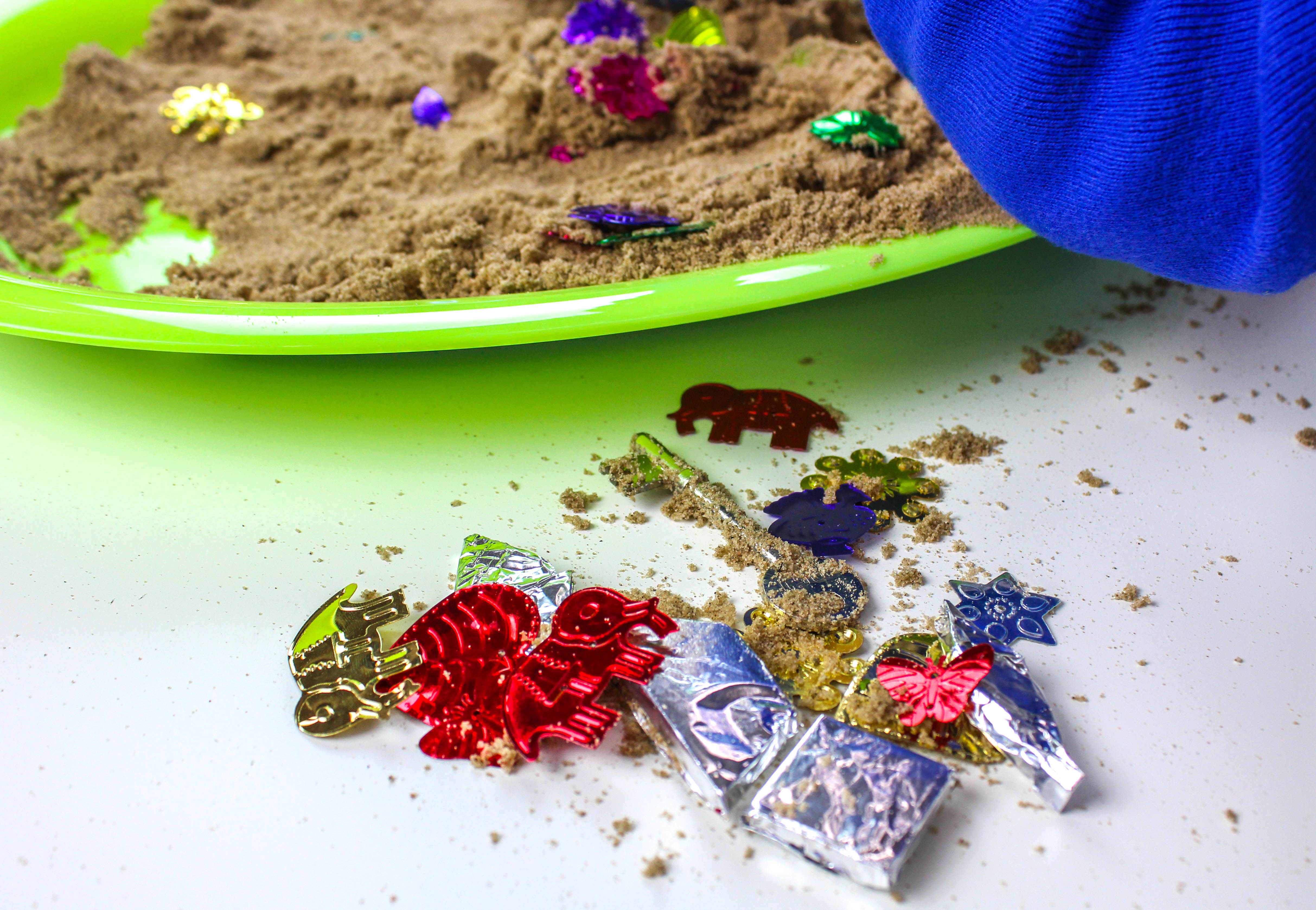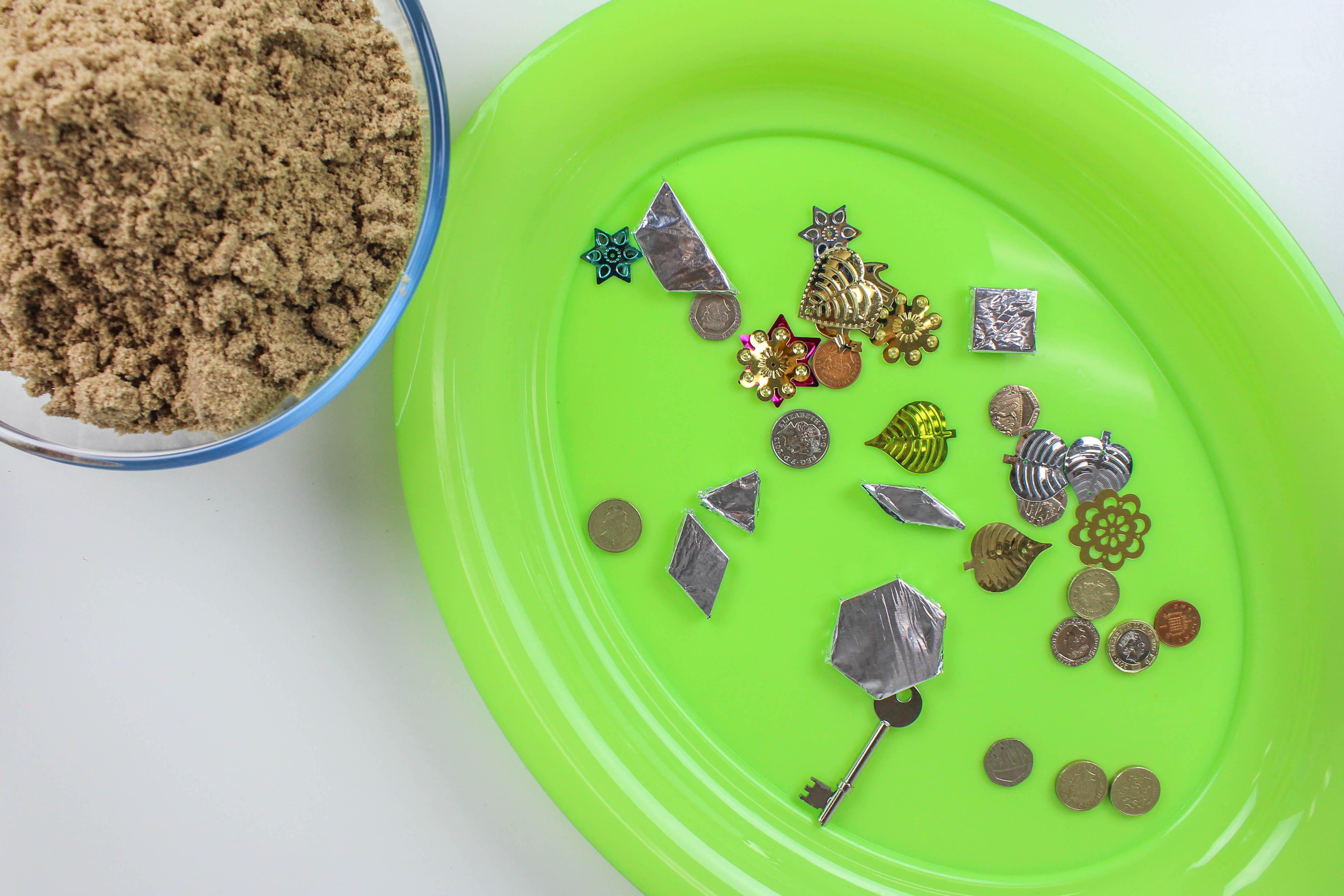 TREASURE! Take a look around the house and you’ll find all kinds of objects you can use, but just remember it’s going to be buried in sand so nothing precious! Keys, coins, bolts, small beads or toy bricks covered with tin foil make excellent shiny treasure.